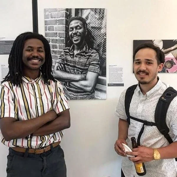 Johnny Lee Chapman III (MTA) posing with photographer Dalvin Nichols II in front of photograph of Chapman captured by Nichols for gallery.